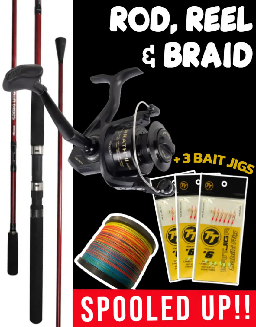 This complete bait jigging combo brings together the Okuma Sabiki UTG Bait Jig Rod, Penn Wrath II 3000 Spin Reel, premium pre-spooled multicolour X8 braid, and TT Sabiki bait jigs to deliver a ready-to-fish solution for efficiently collecting baitfish before your main session begins.