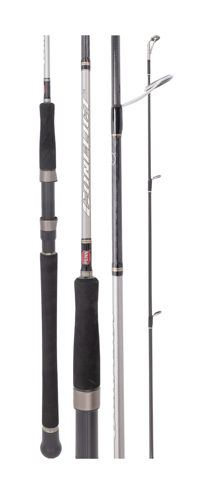 Built on performance-tuned 24T/30T carbon blanks, Conflict spin models feel fast and responsive under load, transmitting bites instantly and driving hooks home with authority. A dual-layer graphite wrap adds torsional strength to keep the blank tracking straight on the cast and under heavy pressure. Fuji O-Ring K-frame guides tame braid for long, tangle-free casts, while the lightweight Penn graphite reel seat and contoured EVA grips provide day-long comfort and secure handling.