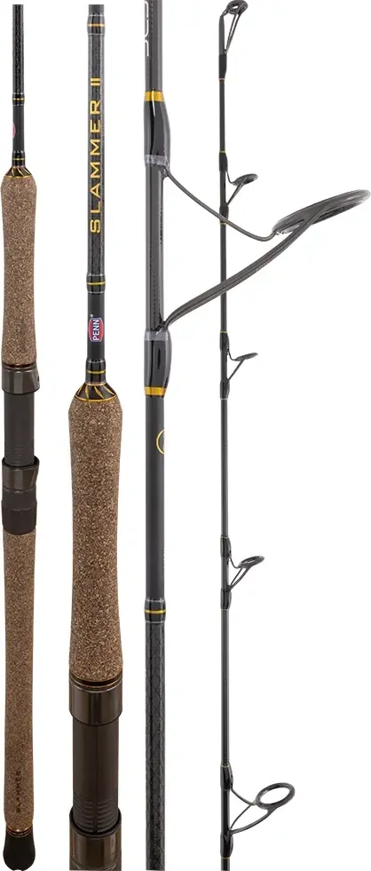 Finished with hybrid EVA and cork grips shaped for improved ergonomics, the Slammer II Spin Rod feels balanced and comfortable during long sessions. Select models feature durable rubber gimbal butts for added stability in rod holders or fighting belts when battling bigger fish offshore.